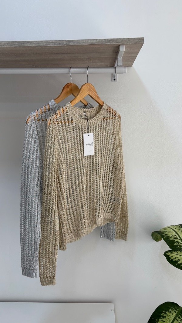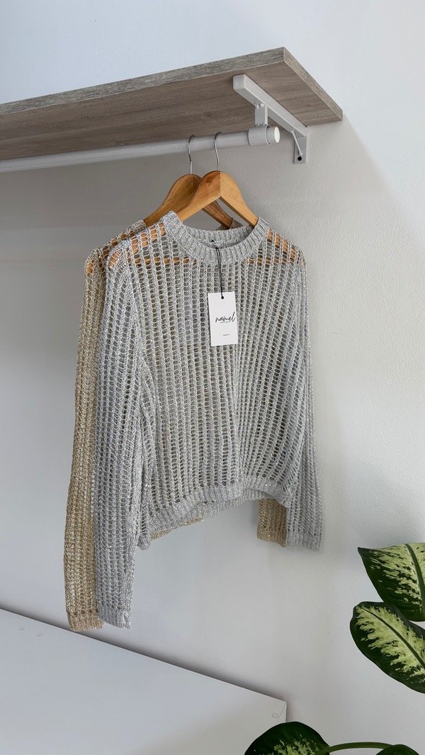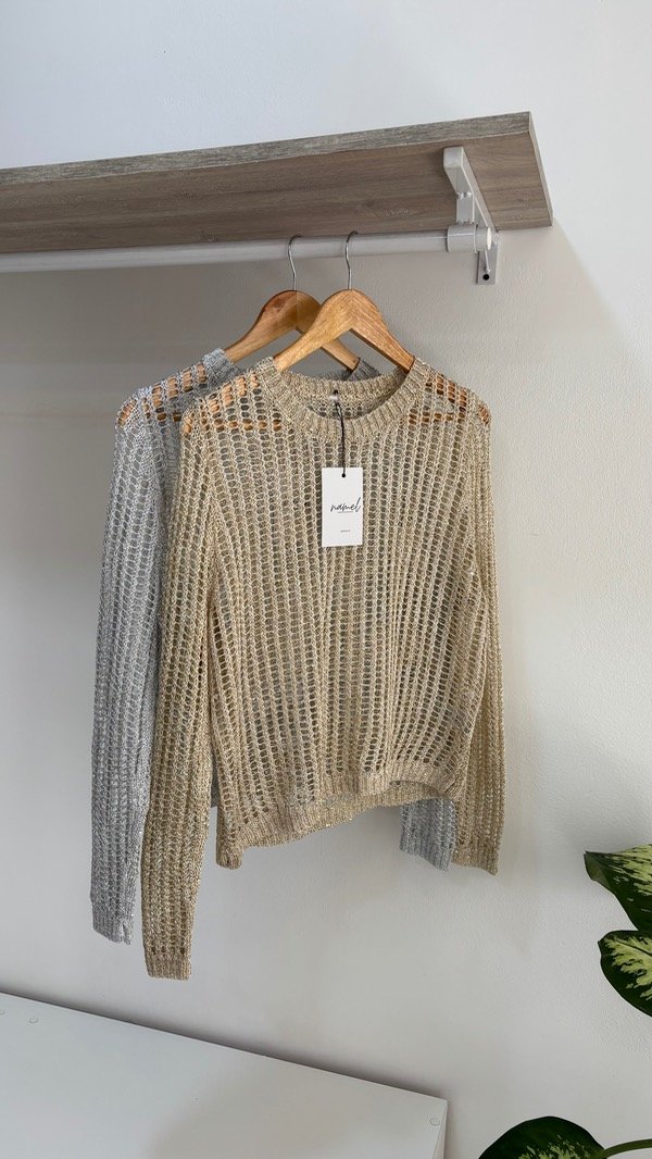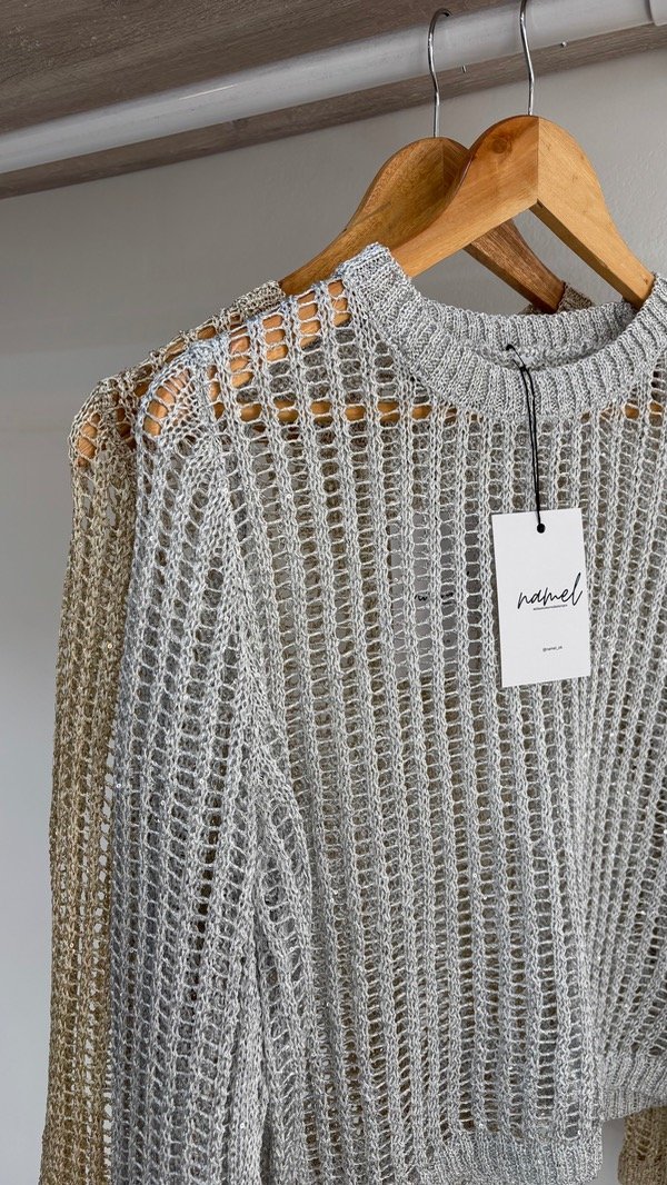 Sueter tejido calado con lentejuelas a tono, cuello cerrado . Amplio