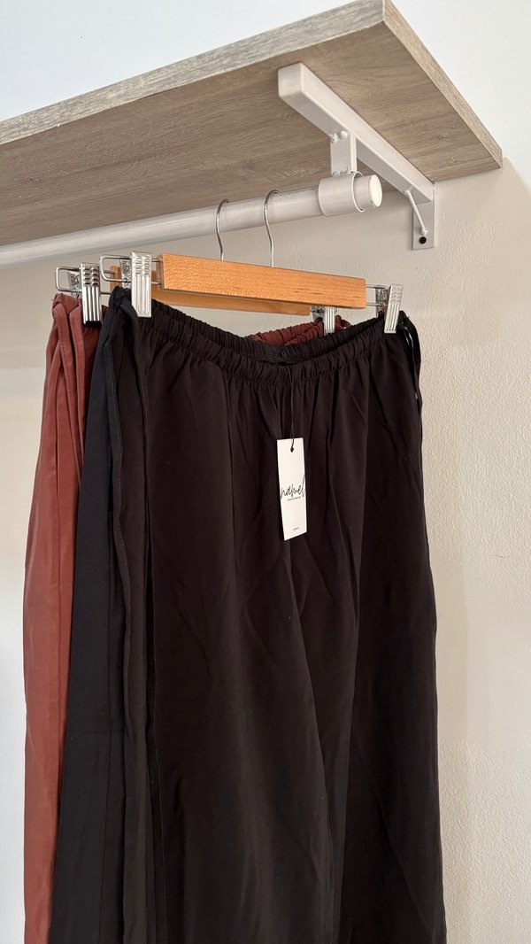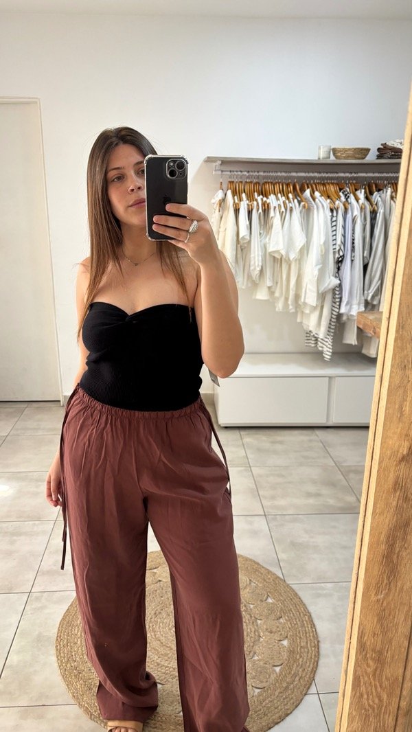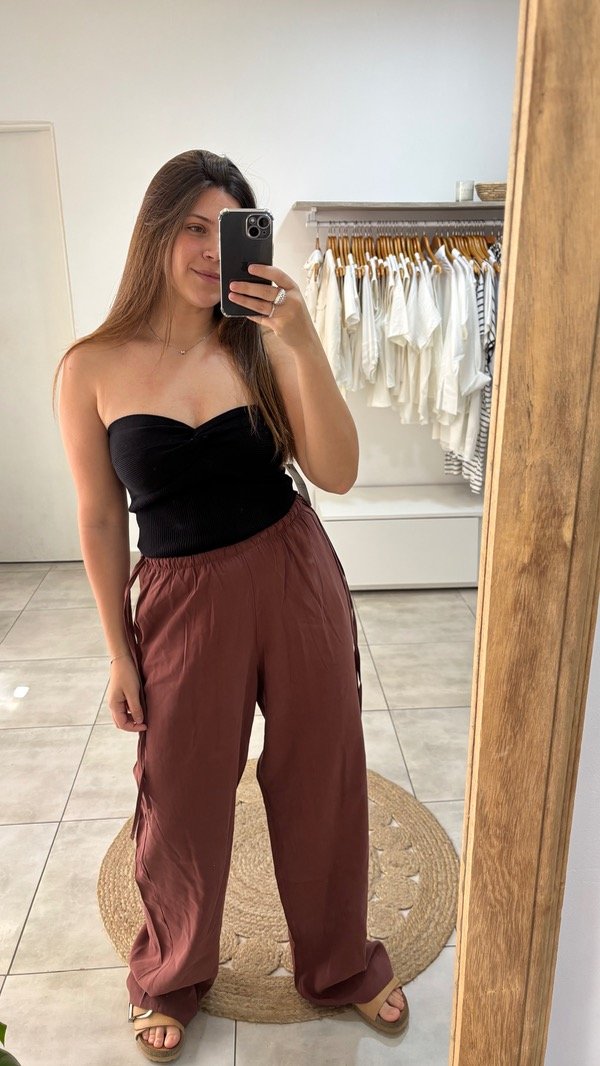 Pantalon amplio recto con bolsillos, elástico en la cintura y tiras en los costados para ajustar