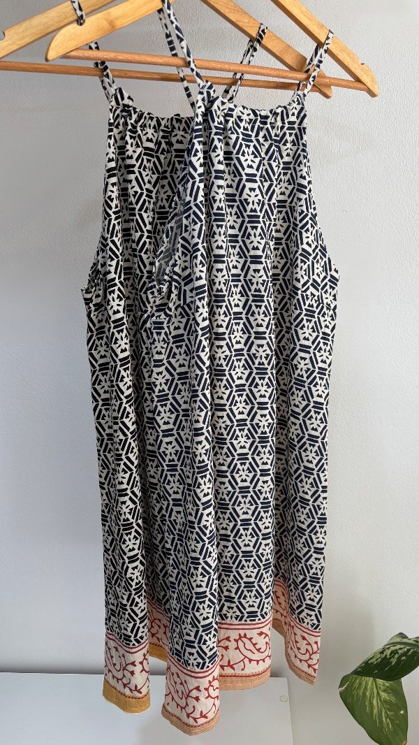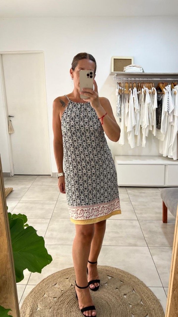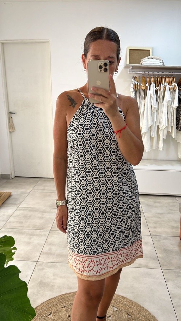 Descripción : Vestido corto estampado & cuello halter. Unico talle